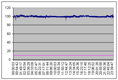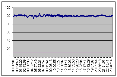 | + | In einem überdachten Busbahnhof sind Lichtschranken-Rauchmelder unter dem Dach installiert. Es sind keine Wände oder Tore vorhanden, die Melder sind nur durch das Dach vor den Wettereinflüssen geschützt. Es wurde ein Protokoll über mehrere Tage geschrieben. Hier die Diagramme von 3 aufeinander folgenden Tagen. | ||