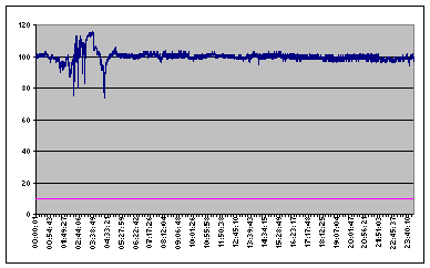 Die Alarmschwelle ist bei 35 % eingestellt. Das protokollierte Signal sank zu keiner Zeit bis zur Alarmschwelle. Zur Alarmgabe müßte das Signal ununterbrochen min. 10 Sekunden lang unter die rot eingezeichnete Alarmschwelle sinken.
