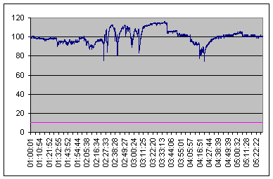 | + | Die Kurve vom Montag zeigte zwischen 1 und 5 Uhr nachts einige Bewegungen, die hier interpretiert werden sollen. Die Uhrzeit und die Länge dieser Schwankungen schließen eine bewußte Störung (Schabernack) aus. | ||