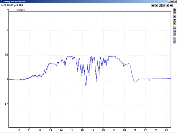 In einem überdachten Busbahnhof sind Lichtschranken-Rauchmelder unter dem Dach installiert. Es sind keine Wände oder Tore vorhanden, die Melder sind nur durch das Dach vor den Wettereinflüssen geschützt. Es wurde ein Protokoll über mehrere Tage geschrieben. Hier die Diagramme von 3 aufeinander folgenden Tagen.
