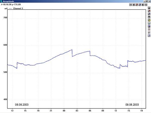 Auffällig ist das Schwanken des Signals, es wiederholt sich rhythmisch von Tag zu Tag. Die Meßwerte wurden mit dem System „picolog“ aufgezeichnet und werden in einem PC zur Auswertung gespeichert. Das System „picolog“ besteht aus einem ein- oder mehr-kanaligen Meßadapter und einer Auswertungssoftware. Die Daten können im PC aufbereitet werden.
