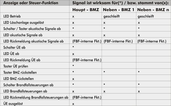 Welche Funktionen das Feuerwehr-Bedienfeld anzeigt, bzw. welche Funktionen für welche Brandmelderzentralen wirksam werden müssen, ist nachstehender Tabelle zu entnehmen:
