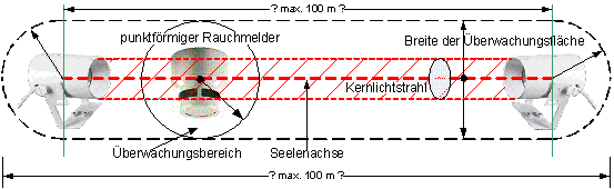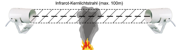 Das Bild zeigt einen Lichtschranken-Rauchmelder mit seinem Kernlichtstrahl. Die Energieversorgung des Senders kann aus einer separaten Quelle erfolgen. Wesentlich ist die zwangsläufige Selbstüberwachung des Melders, er ist eine Lichtschranke.