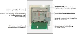 Die Unterstützung der schnellen und präzisen Branddetektion durch die Brandmelderzentrale, ist der schnelle und gewaltfreie Gebäudezutritt für Einsatzkräfte der Feuerwehr und die schnelle und präzise Brandlokalisation vor Ort. Die Feuerwehr-Peripherie als eigenständiger Lösungsansatz, steigert die Qualität der Erkundungssicherheit und -geschwindigkeit der Einsatzkräfte.