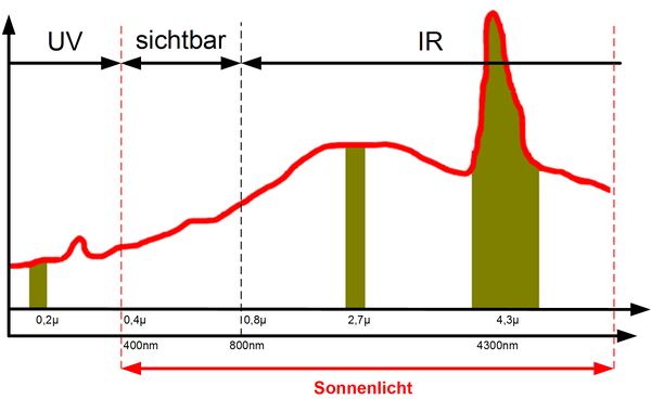 Bei den Wellenlängen 2.800 nm und 4.300 nm kommt auch kein IR-Licht der Sonne auf der Erde an.