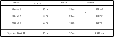 Klasse / VdS Reichw., max. Kantenl. Max. Ü.-Fläche max. Klasse 1 45 m 26 m 676 m2 Klasse 2 33 m 20 m 400 m2 Klasse 3 23 m 13 m 169 m2