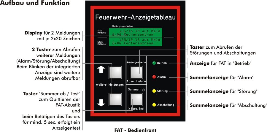Die Daten der BMZ-Ausgangsschnittstelle werden vom FAT ausgewertet und aufbereitet. Eine Veränderung der anzuzeigenden FAT-Informationen darf nur nach dem Öffnen des Gehäuses durch eine berechtigte Person erfolgen. Mit technischen oder organisatorischen Maßnahmen muss sichergestellt werden, dass die anzuzeigenden Informationen der BMZ und des FATs inhaltlich übereinstimmen. Im Display müssen zwei Meldungen mit jeweils zwei zusammenhängende Zeilen und insgesamt 40 Zeichen darstellbar sein. Die erste Meldung hat links oben zu beginnen.