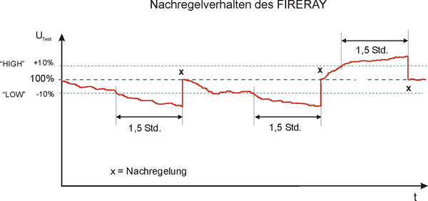 Die Anzahl der Regelschritte und die Länge der Zeitintervalle schwanken innerhalb der Norm-Toleranzen. Kommt der Lichtschranken-Rauchmelder an das Ende seines Nachregelungs-Vermögens, so gibt er wahlweise eine ALARM-oder Störmeldung (nach VdS) ab. Diese Störmeldung wird im Melder gespeichert.