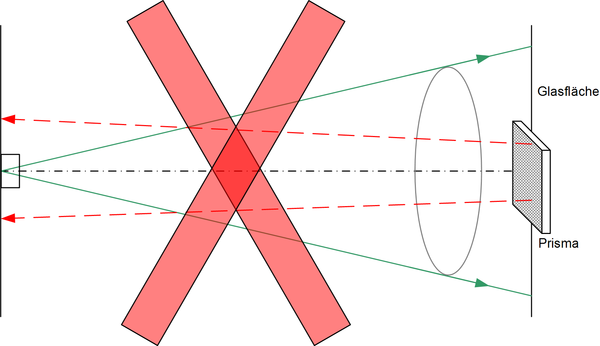 In dieser Darstellung trifft das Senderlicht senkrecht auf die Prismenplatte und auf die Glasfläche. Deckt man zum Testen der Störmeldung das Prisma ab, so wird wahrscheinlich der Empfänger so viel vom Glas reflektiertes Licht empfangen, dass er nicht Störung, sondern Alarm meldet, wie oben beschrieben.