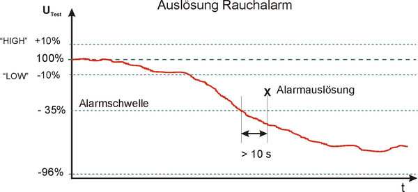 Eine ca. 10 Sekunden lange und ununterbrochene Dämpfung des Signals innerhalb der ALARM-Schwellwerte führt zum ALARM. Es kann im Brandmelder gewählt werden, ob der ALARM gespeichert bleibt oder sich der Melder automatisch zurücksetzen soll, sobald das Brandkriterium nicht mehr erfüllt ist.